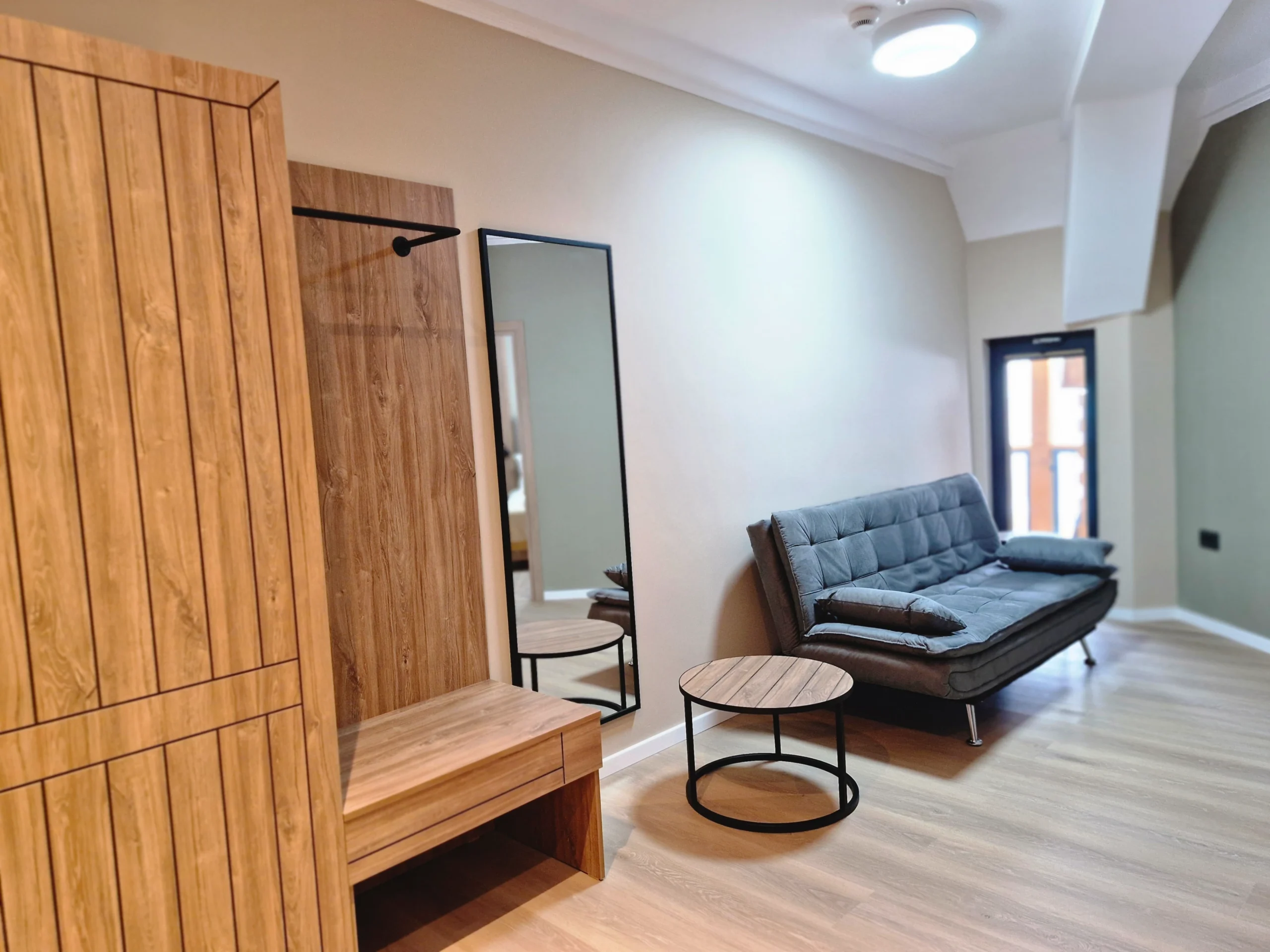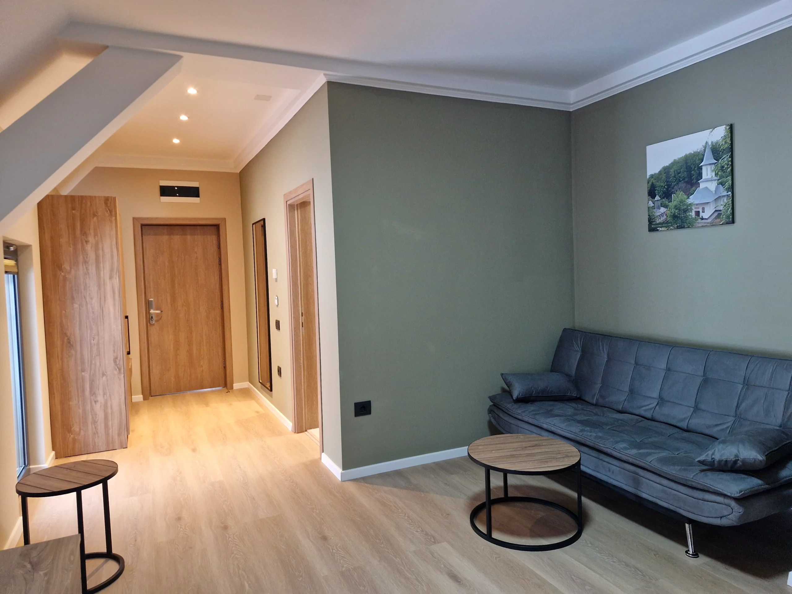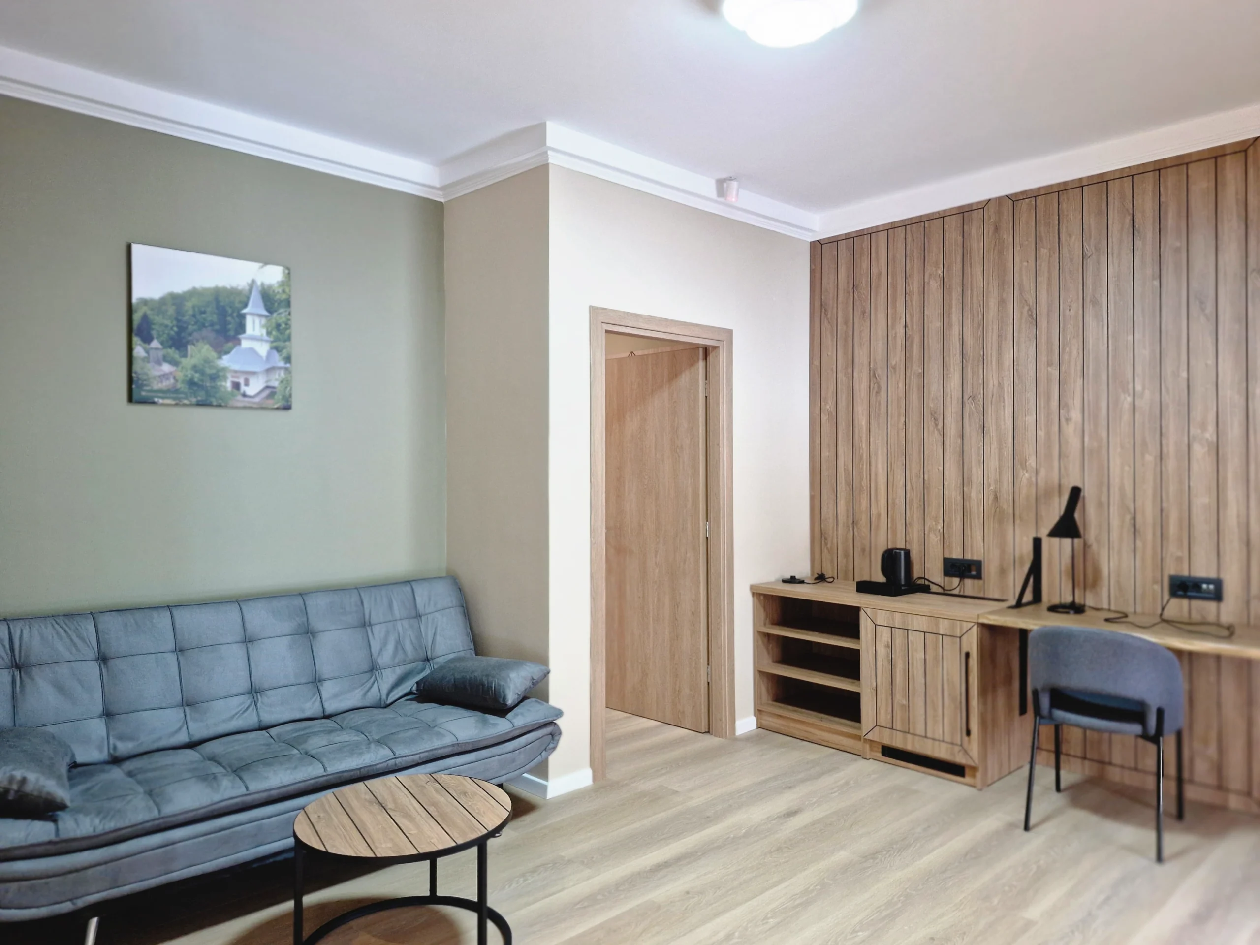Aceste unități de cazare includ un living generos, separat de zona de dormit, un detaliu care adaugă confort suplimentar și permite atât relaxare, cât și activități distincte în cadrul aceluiași spațiu. Livingul este luminat natural și amenajat cu mobilier modern, creând o atmosferă caldă și primitoare.