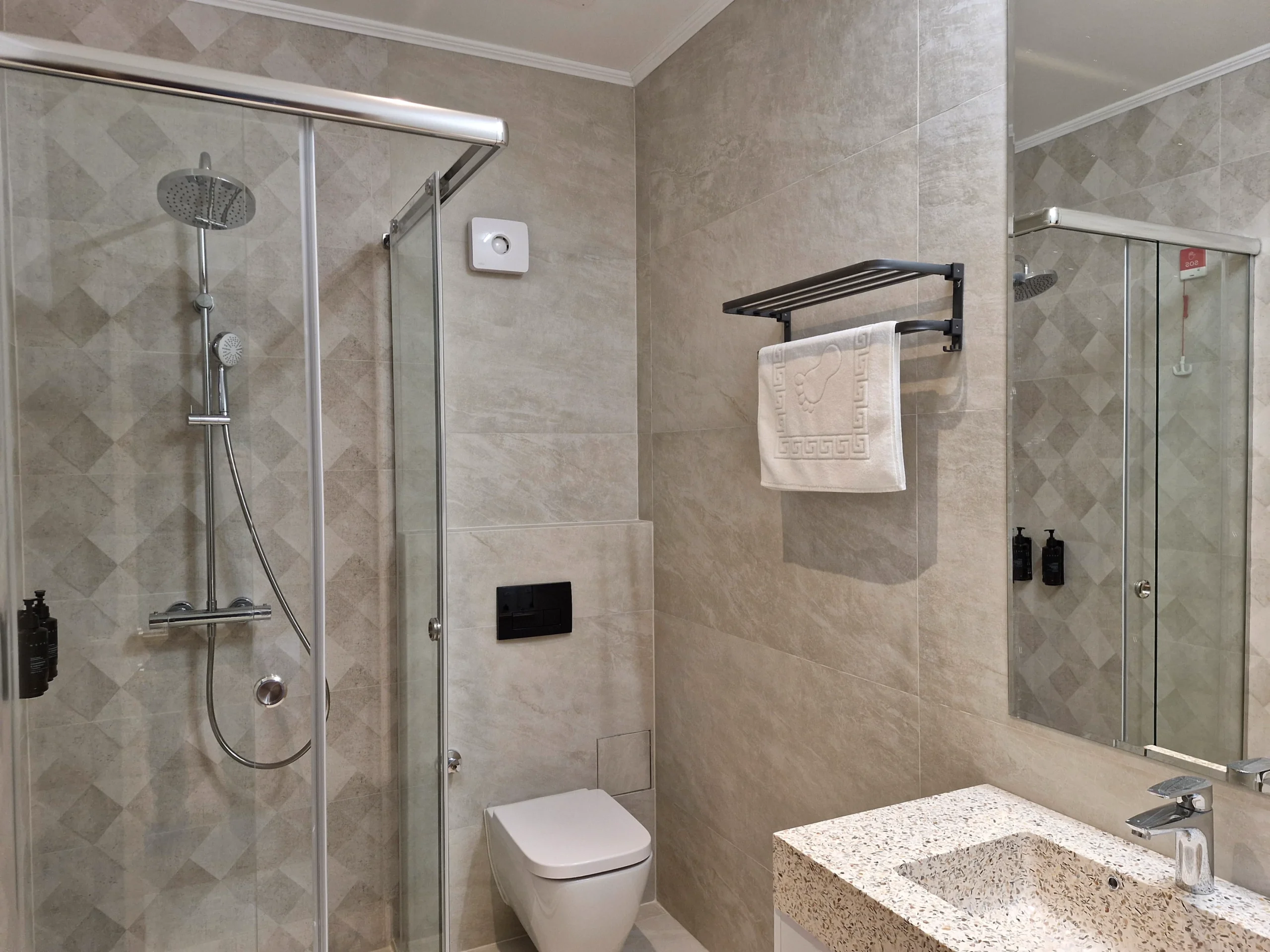 Baia este dotată cu duș modern walk-in, spre deosebire de varianta Deluxe care include atât cadă, cât și duș. Finisajele sunt premium, iar spațiul este proiectat pentru funcționalitate maximă.